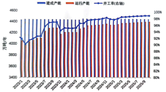 2025年10月,國(guó)內(nèi)電解鋁生產(chǎn)能力保持高位持穩(wěn)。截至10月底建成產(chǎn)能4470萬(wàn)噸/年,運(yùn)行產(chǎn)能4420萬(wàn)噸/年,與上月基本持平。未來(lái)兩個(gè)月,隨著扎鋁二期35萬(wàn)噸/年建成,預(yù)計(jì)2025年底建成產(chǎn)能將達(dá)到4505萬(wàn)噸/年。在產(chǎn)能幾近“天花板”,開(kāi)工率始終維持98%以上背景下,無(wú)論是產(chǎn)能還是產(chǎn)量的增長(zhǎng)空間都極為有限。